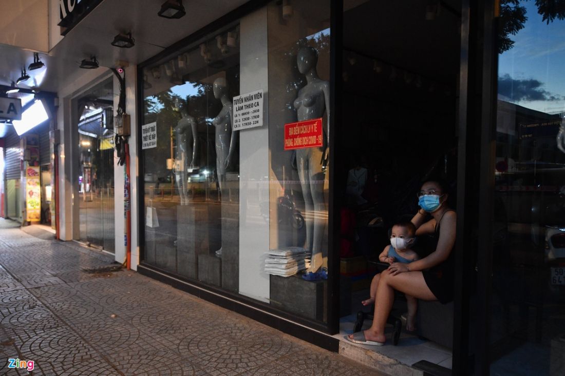 Chị Trần Thị Thu Hiền cùng con trai ngồi trước nhà, lặng lẽ nhìn ra đường Xô Viết Nghệ Tĩnh lúc 18h15. “Hôm nay thành phố hạn chế tối thiểu việc ra đường, phố xá không bóng người, tôi mới dám đây ngồi”, chị Hiền chia sẻ.
