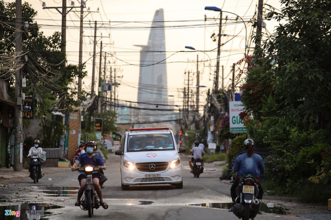 Trên đường Lương Định Của, xe của lực lượng làm công tác chống dịch vẫn ra vào thường xuyên sau 18h. Đây là tuyến đường dẫn vào các bệnh viện dã chiến thuộc khu tái định cư Thủ Thiêm, TP Thủ Đức.
