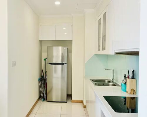 - Khu bếp nhỏ đầy đủ tiện nghi : Bếp từ, tủ lạnh, máy hút mùi, bồn rửa chén và các dụng cụ nấu ăn cơ bản, giúp bạn dễ dàng chuẩn bị những bữa ăn ngon tại nhà.