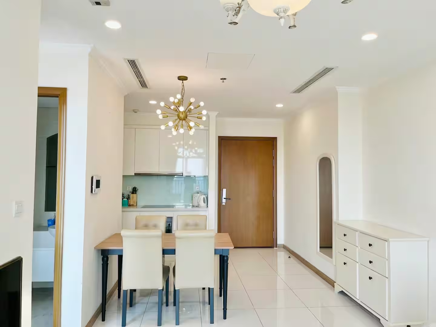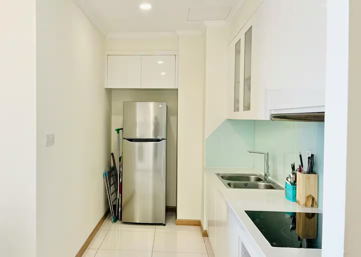 - Khu bếp nhỏ đầy đủ tiện nghi : Bếp từ, tủ lạnh, máy hút mùi, bồn rửa chén và các dụng cụ nấu ăn cơ bản, giúp bạn dễ dàng chuẩn bị những bữa ăn ngon tại nhà.