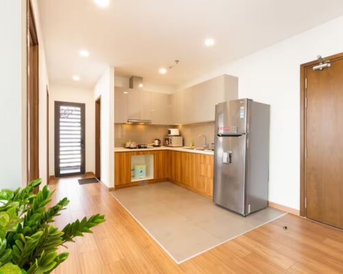 • Khu bếp nhỏ đầy đủ tiện nghi : Bếp từ, tủ lạnh, máy hút mùi, bồn rửa chén và các dụng cụ nấu ăn cơ bản, giúp bạn dễ dàng chuẩn bị những bữa ăn ngon tại nhà.