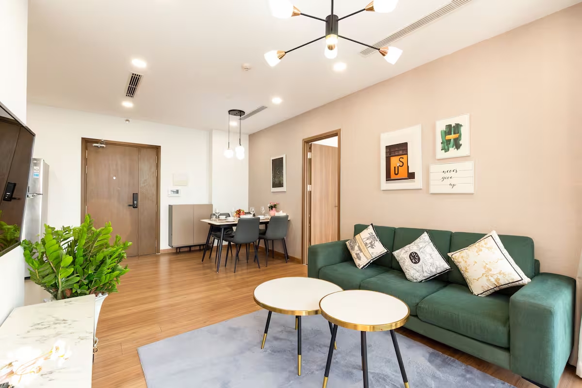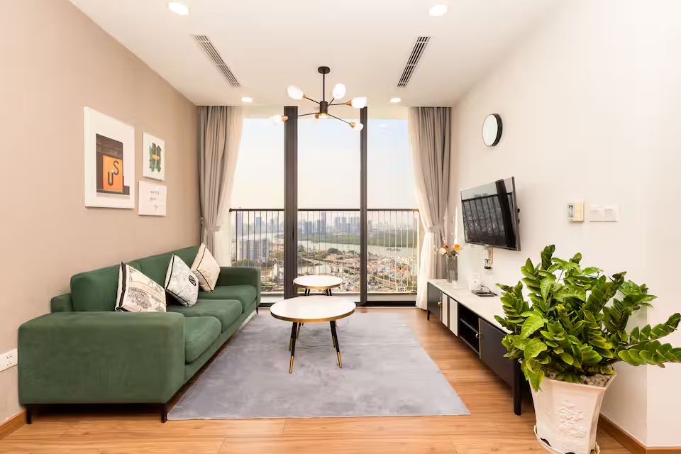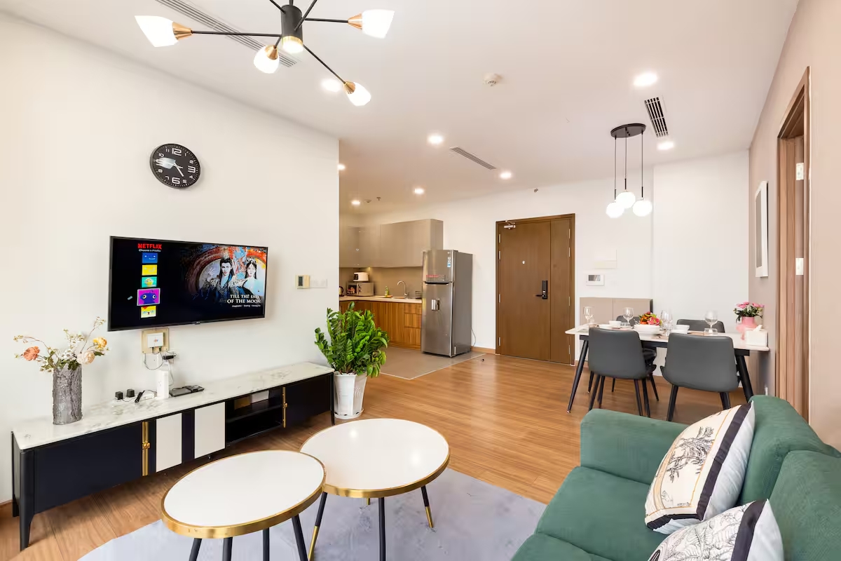 • Phòng khách: Sofa tiện nghi, TV màn hình lớn để bạn thư giãn sau một ngày dài.