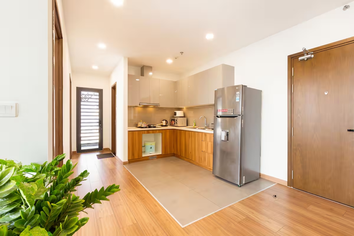 • Khu bếp nhỏ đầy đủ tiện nghi : Bếp từ, tủ lạnh, máy hút mùi, bồn rửa chén và các dụng cụ nấu ăn cơ bản, giúp bạn dễ dàng chuẩn bị những bữa ăn ngon tại nhà.