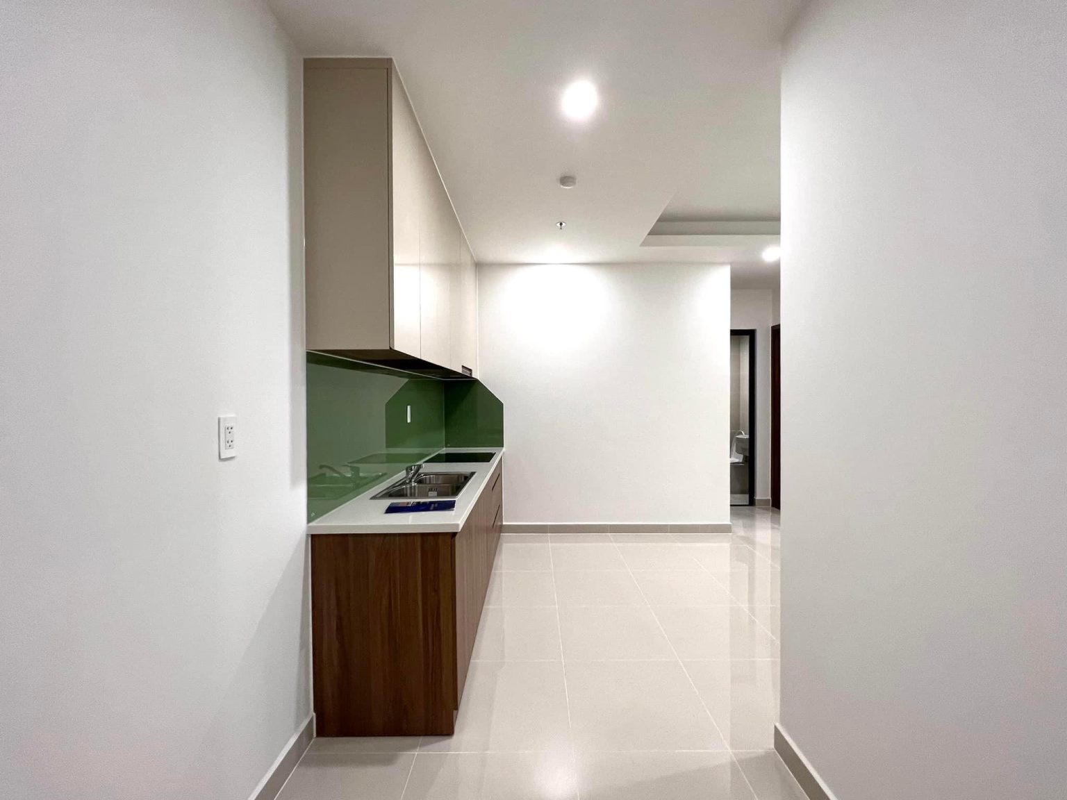 - Khu bếp nhỏ đầy đủ tiện nghi : Bếp từ, máy hút mùi, bồn rửa chén, tủ bếp trên tủ bếp dưới.
