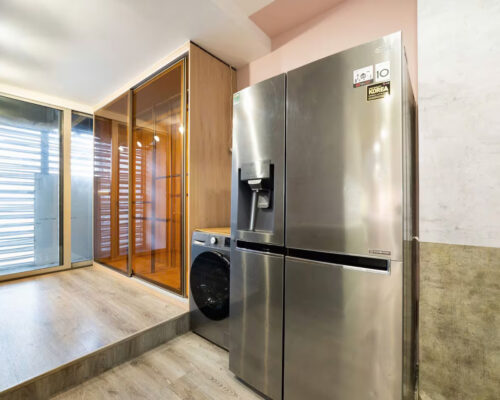 • Khu bếp nhỏ đầy đủ tiện nghi : Bếp từ, tủ lạnh, máy hút mùi, bồn rửa chén và các dụng cụ nấu ăn cơ bản, giúp bạn dễ dàng chuẩn bị những bữa ăn ngon tại nhà.