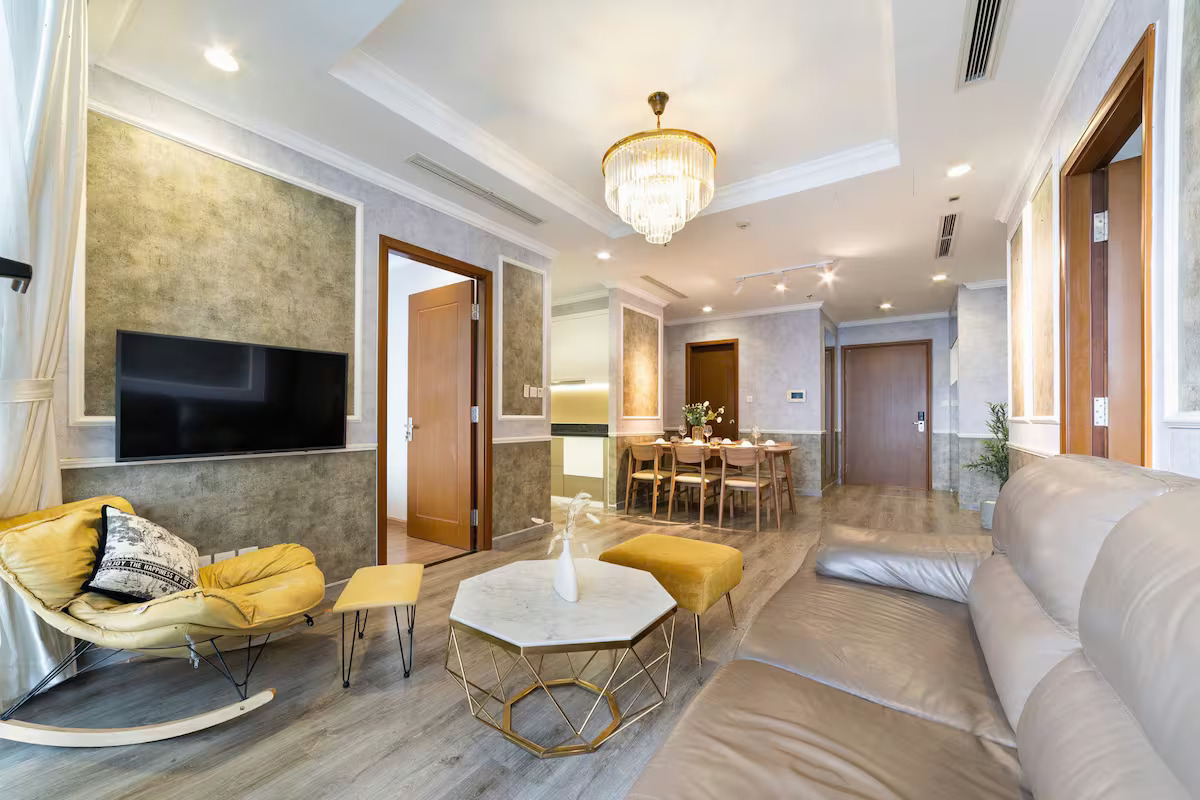 • Phòng khách: Sofa tiện nghi, TV màn hình lớn để bạn thư giãn sau một ngày dài.