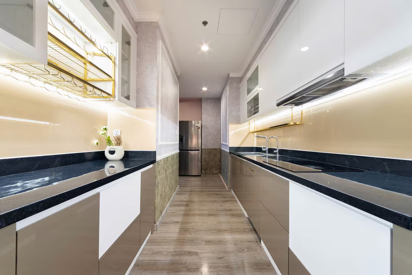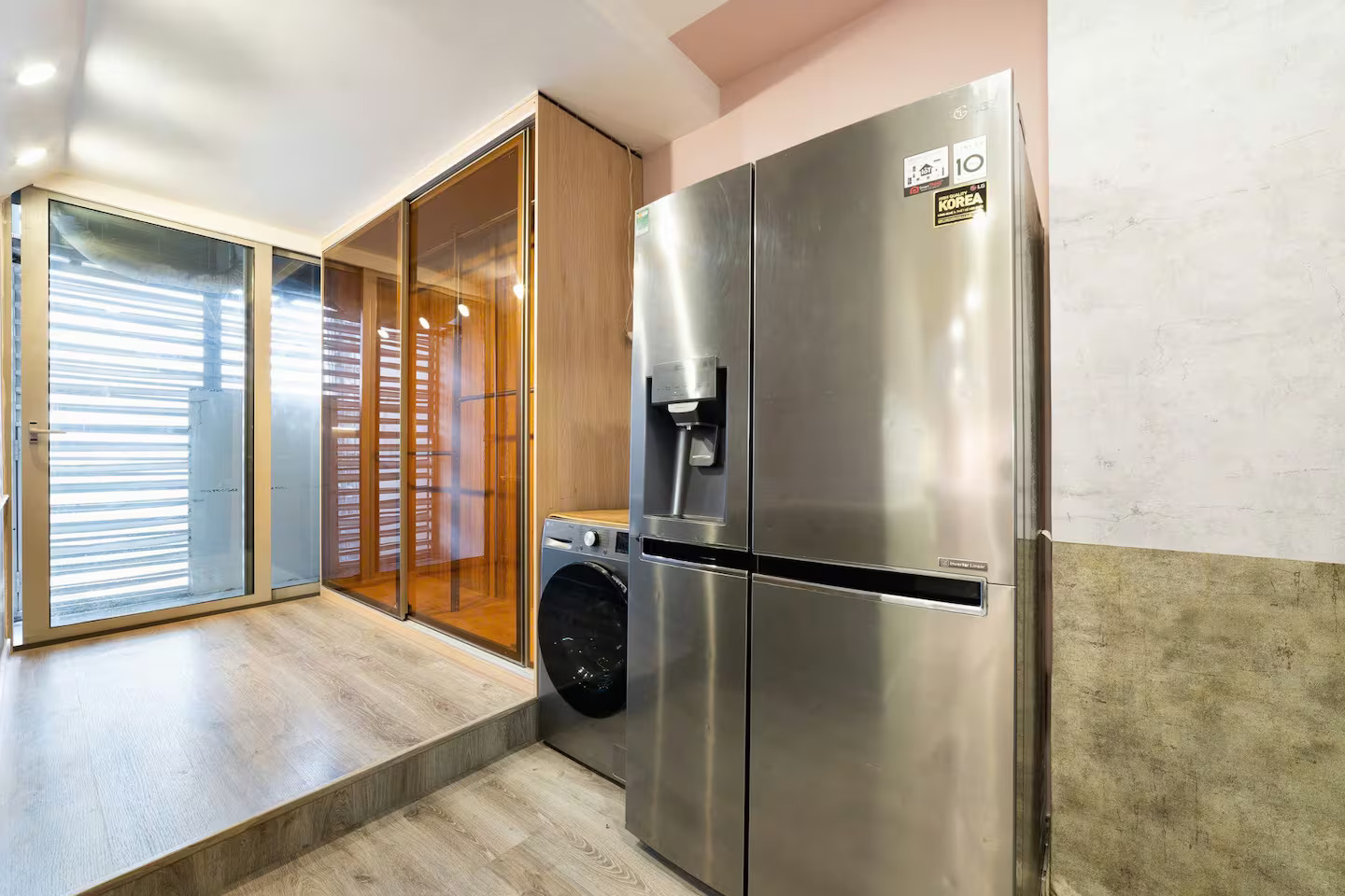 • Khu bếp nhỏ đầy đủ tiện nghi : Bếp từ, tủ lạnh, máy hút mùi, bồn rửa chén và các dụng cụ nấu ăn cơ bản, giúp bạn dễ dàng chuẩn bị những bữa ăn ngon tại nhà.