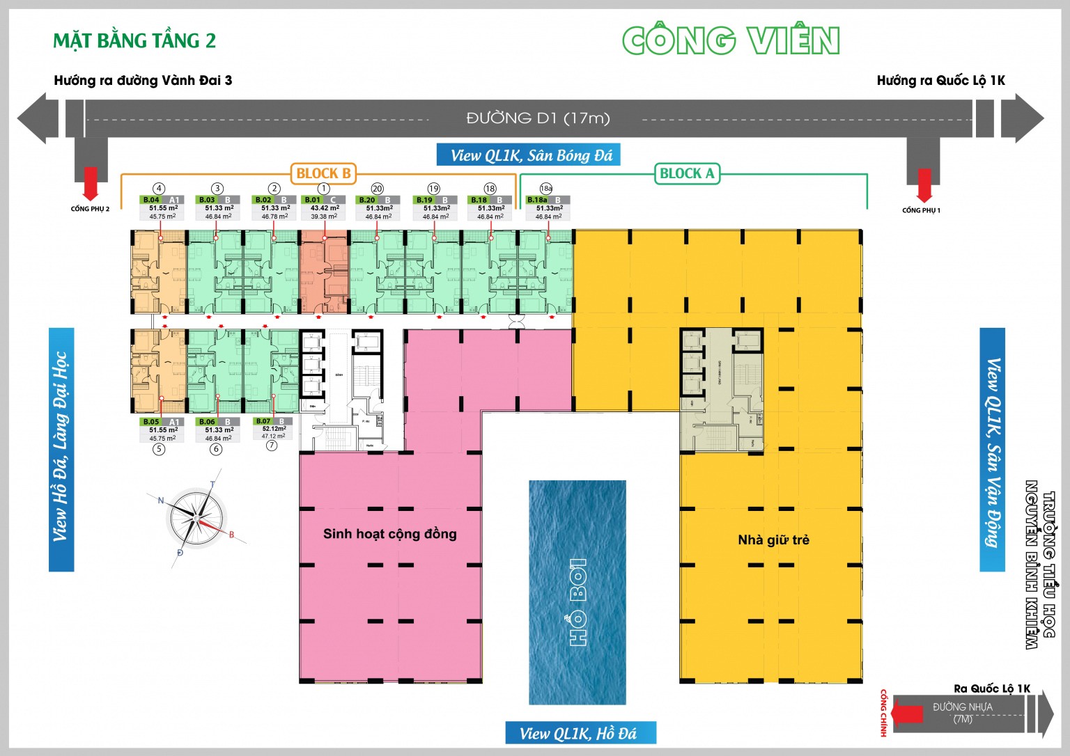 - Diện tích: 2PN – 1WC: 43-44m2; 2PN – 2WC: 51-58m2