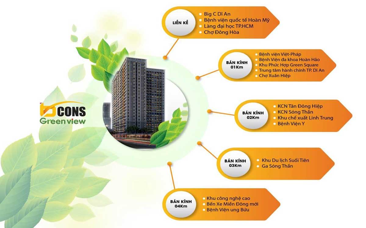 Bcons Green View toạ lạc ngay vị trí trung tâm hành chính Dĩ An, Bình Dương. Sở hữu hạ tầng giao thông hoàn chỉnh và là tâm điểm kết nối đến các khu vực trọng yếu trong Dĩ An cũng như là TP. Hồ Chí Minh, Biên Hoà. Trong bán kinh 4KM dự án có thể kết nối: