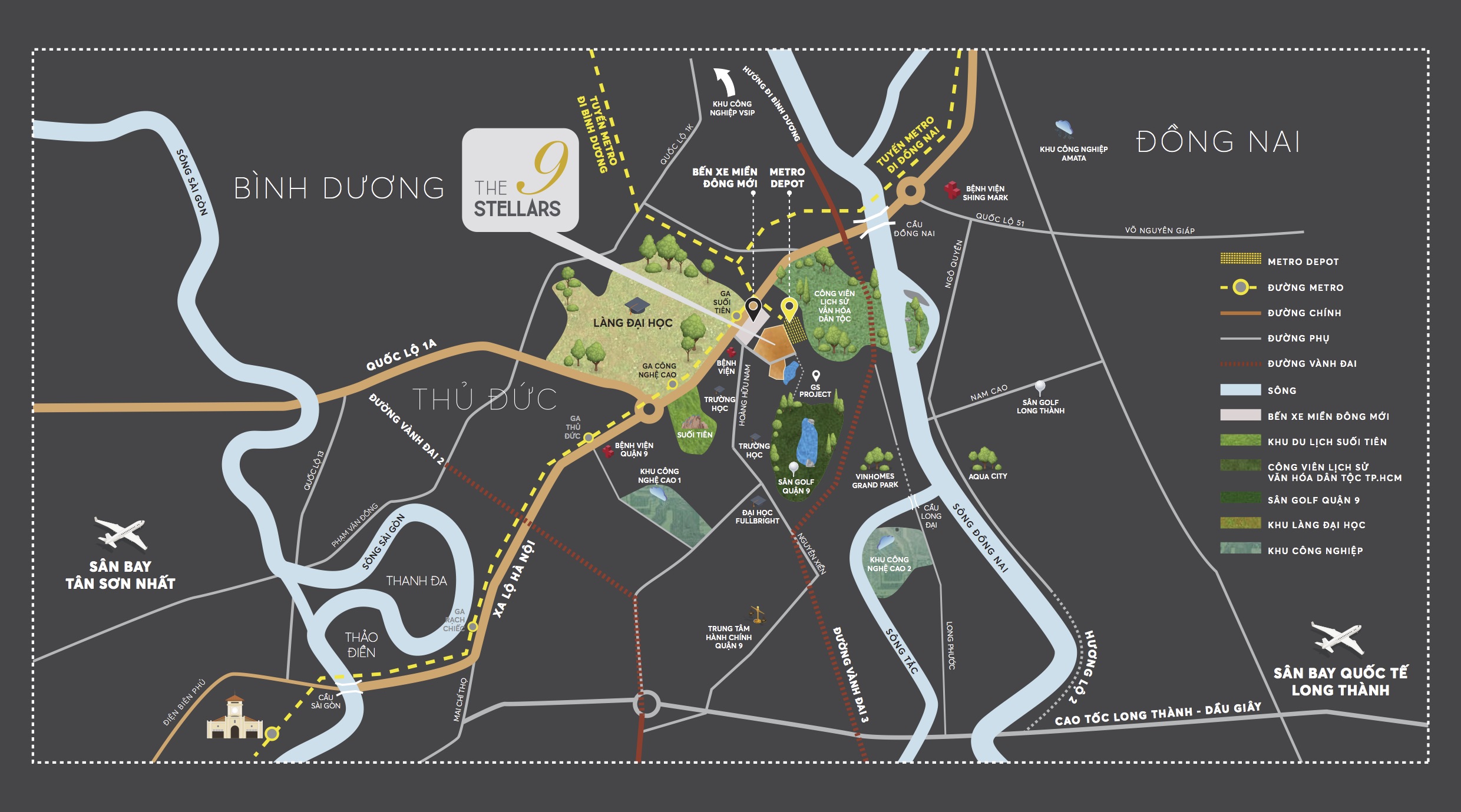 - The 9 Stellars được sở hữu vị trí giao thông thuận tiện và gần kề với các tuyến đường huyết mạch Xa Lộ Hà Nội, trạm cuối Metro, và các con đường nội khu đã hoàn thiện.