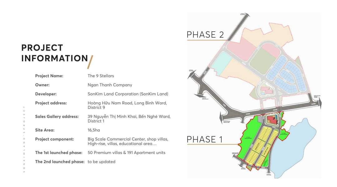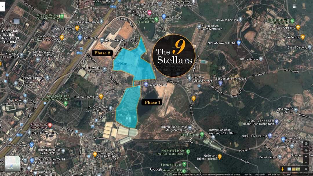 Vị trí dự án The 9 Stellars Sơn Kim Land ở tại đường Hoàng Hữu Nam, phường Long Bình, Quận 9. Bên cạnh là bến xe miền Đông, ga tuyến Metro số 1 và công viên văn hóa dân tộc. Khu Villa mở bán giai đoạn 1 có vị trí ngay bên Hồ Đá Đen.
