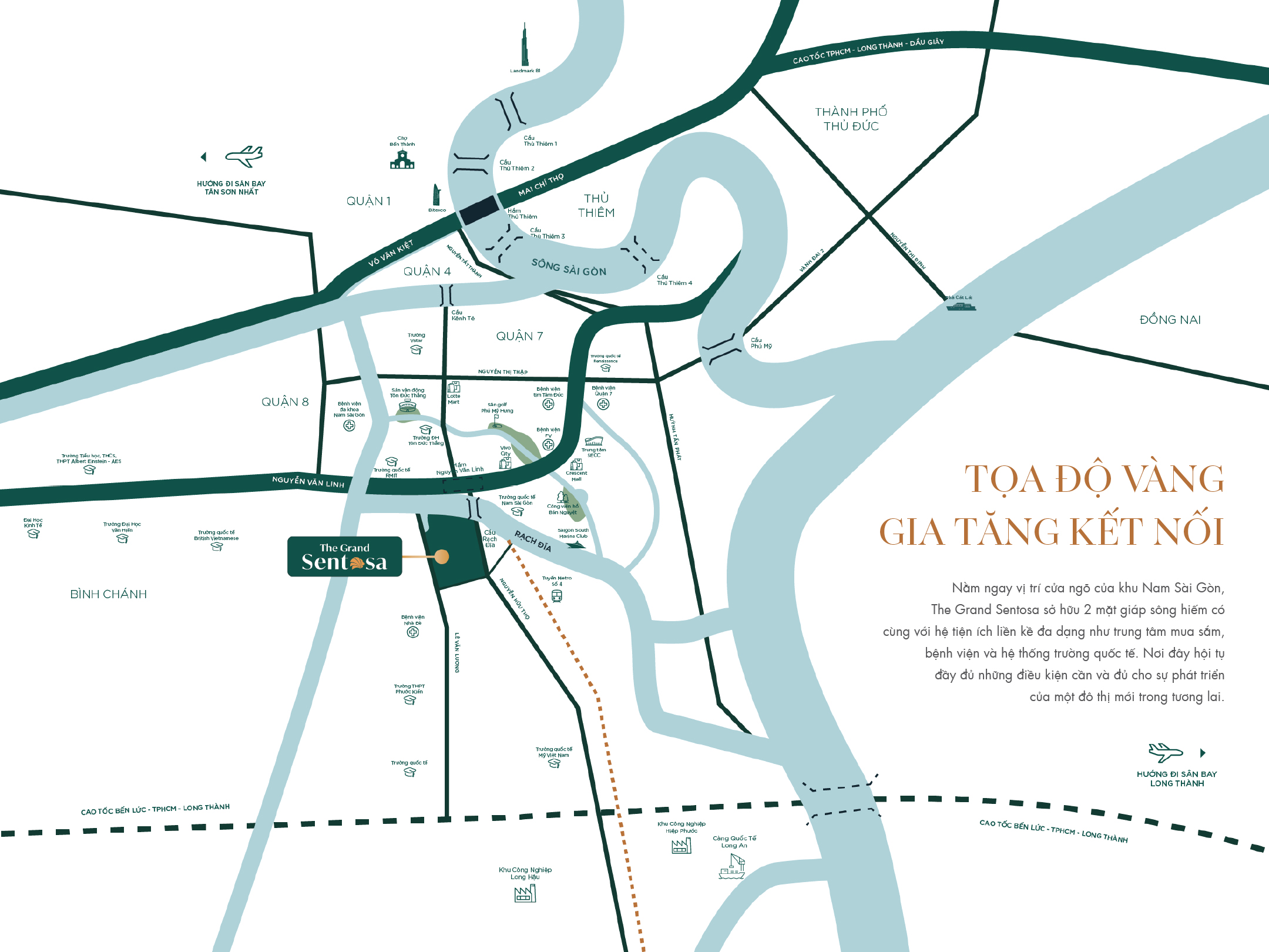 Vị trí địa chỉ đất nền dự án The Grand Sentosa Nhà Bè tọa lạc trên mặt tiền đường số 116A Nguyễn Hữu Thọ, xã Phước Kiểng, Q. Nhà Bè, TP.HCM là tuyến đường huyết mạch kết nối các quận trung tâm của thành phố và dễ dàng di chuyển qua các tỉnh thành lân cận, The Grand Sentosa hứa hẹn sẽ là một khu đô thị sầm uất và đầy tiềm năng tại Nhà Bè trong tương lai.
