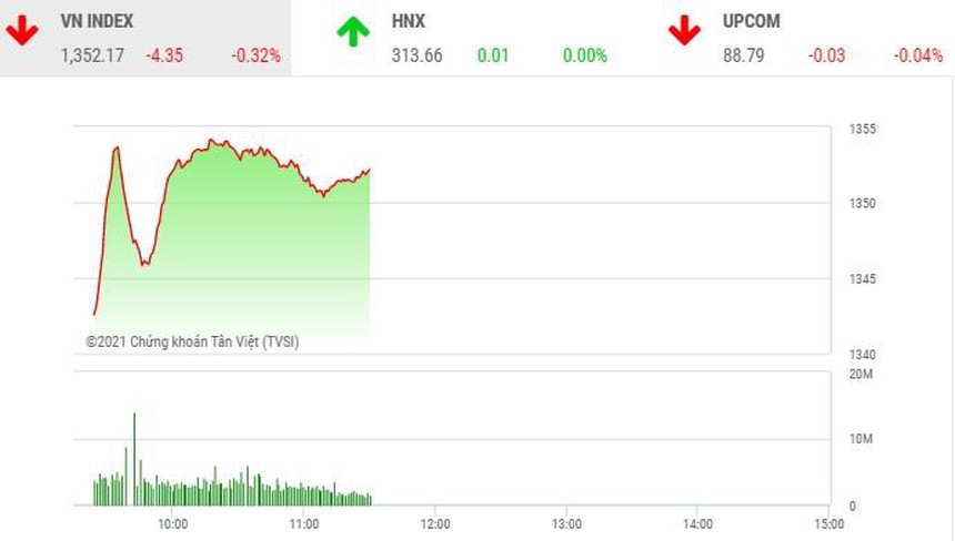 Chốt phiên sáng, sàn HOSE có 170 mã tăng và 214 mã giảm, VN-Index giảm 4,35 điểm (-0,32%), xuống 1.352,17 điểm. Tổng khối lượng giao dịch đạt hơn 423,7 triệu đơn vị, giá trị 12.077 tỷ đồng, giảm gần 13% về khối lượng và 20% về giá trị so với phiên sáng hôm qua. Giao dịch thỏa thuận đóng góp hơn 16,3 triệu đơn vị, giá trị 879 tỷ đồng.