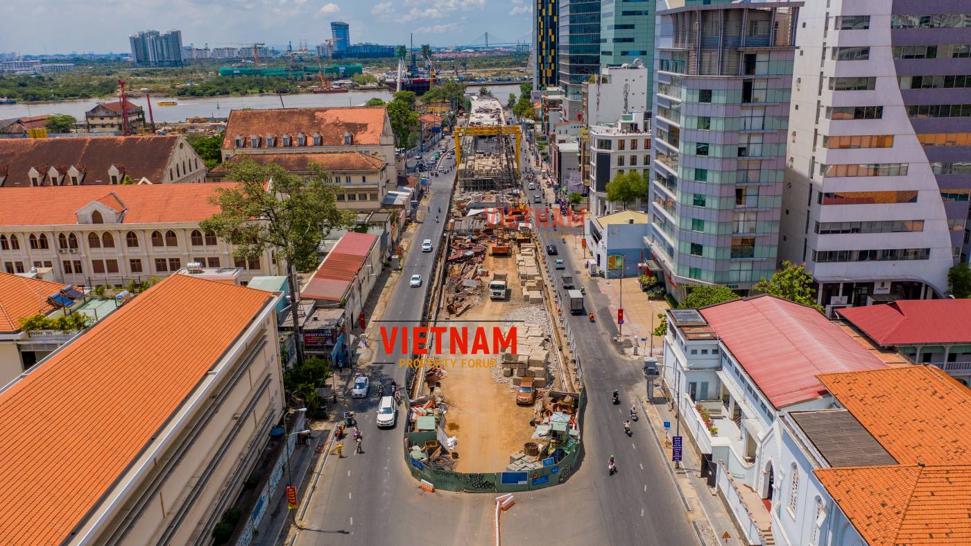 Bên hướng quận 1, đường dẫn cầu dọc đường Tôn Đức Thắng đang được trải thảm bê tông nhựa. Để thi công dự án, đơn vị nhà thầu đã lập hàng rào chắn đảm bảo an toàn cho các phương tiện. Cả trăm cây cổ thụ đã được di dời để nhường chỗ xây dựng cầu. Phần thân cầu mới chỉ nhô ra khỏi bờ sông, chưa có nhiều hạng mục.