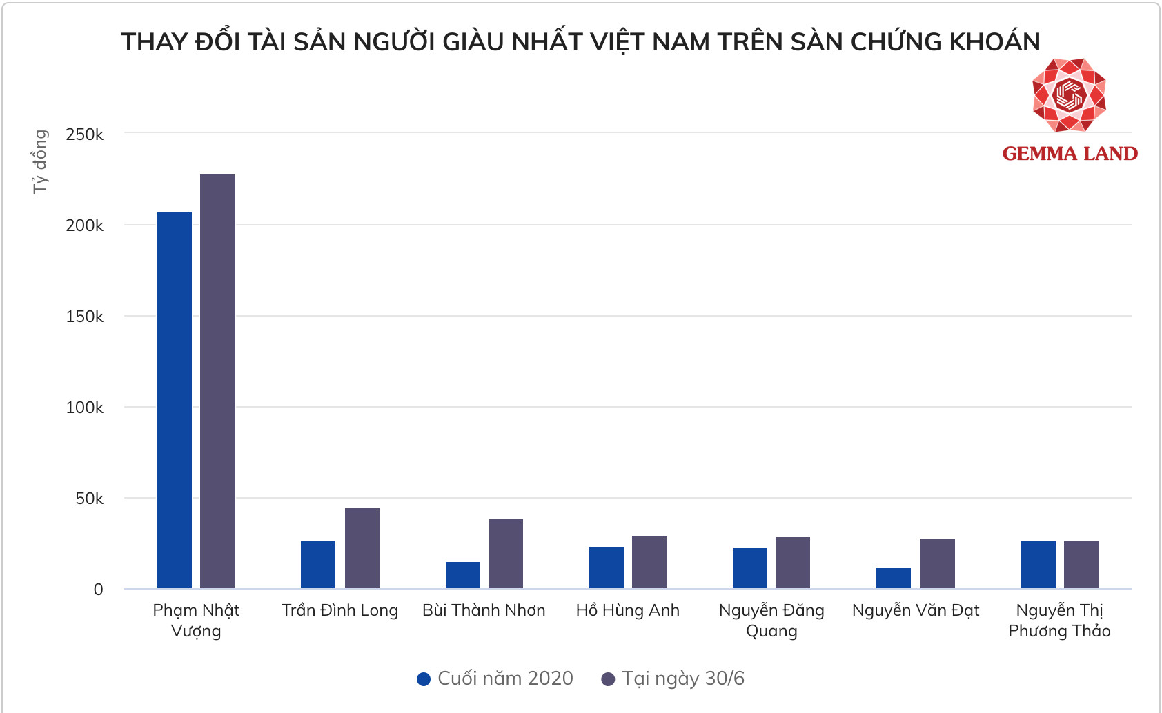 Thị trường chứng khoán nửa đầu năm 2021 biến động khá tích cực khi chỉ số liên tục phá đỉnh, sự tăng giá lan tỏa ở hầu hết nhóm cổ phiếu. Đà tăng giá này đang giúp tài sản nhiều cá nhân ngày càng mở rộng, qua đó làm thay đổi đáng kể bảng xếp hạng những người giàu nhất Việt Nam.